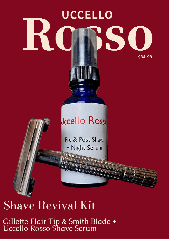 In a world of shortcuts, Uccello Rosso stands apart. That’s why we’ve paired it with a piece of shaving history—a vintage Gillette Flair Tip razor and a precision blade from Smith Blade. Whether you're shaving or showcasing, this kit is ready for use or display.
